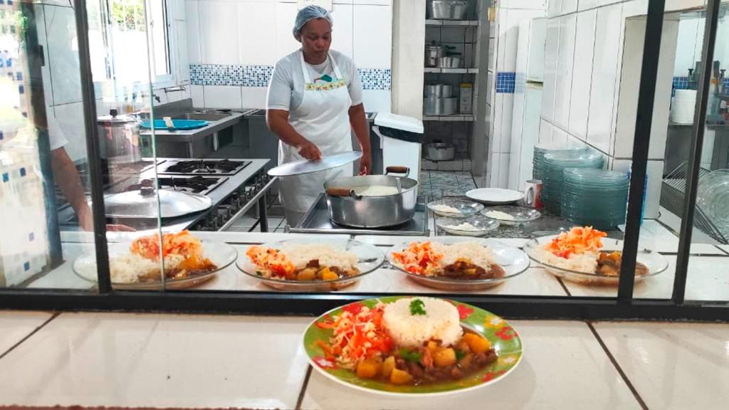 Responsável há 25 anos pela merenda na unidade, Vilma Ribeiro de Ataíde Souza explica que a rotina foi aprimorada em 2026. “Agora servimos fruta todos os dias como lanche de entrada. Duas vezes por semana oferecemos pão ou bolo. Muitas crianças chegam cedo e moram longe, então já tomam o café da manhã às 6h30. No recreio, às 9h20, servimos a refeição principal, com carne, arroz, macarrão, mandioca, saladas e verduras”, relata. A escola atende cerca de 660 alunos, sendo que mais da metade se alimenta diariamente na unidade.