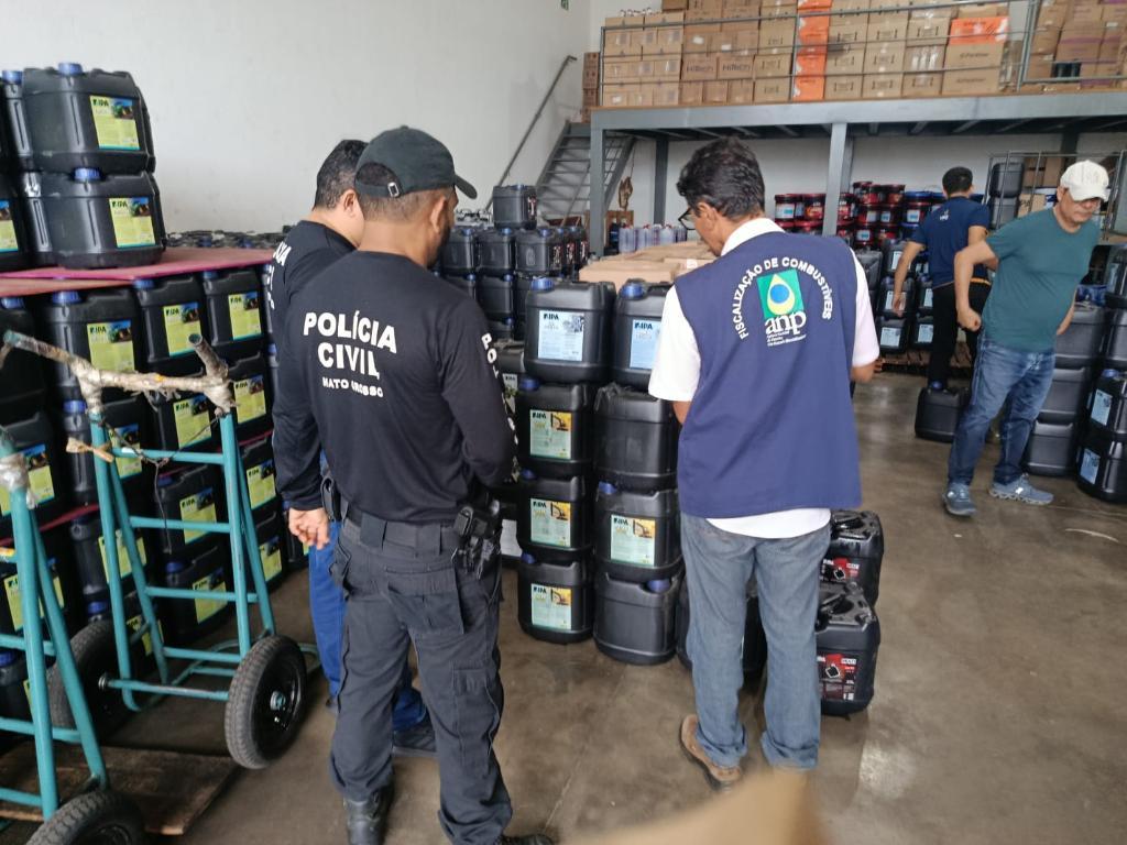 Polícia Civil e ANP apreendem mais de 2,6 mil litros de óleo lubrificante em distribuidora de Cuiabá